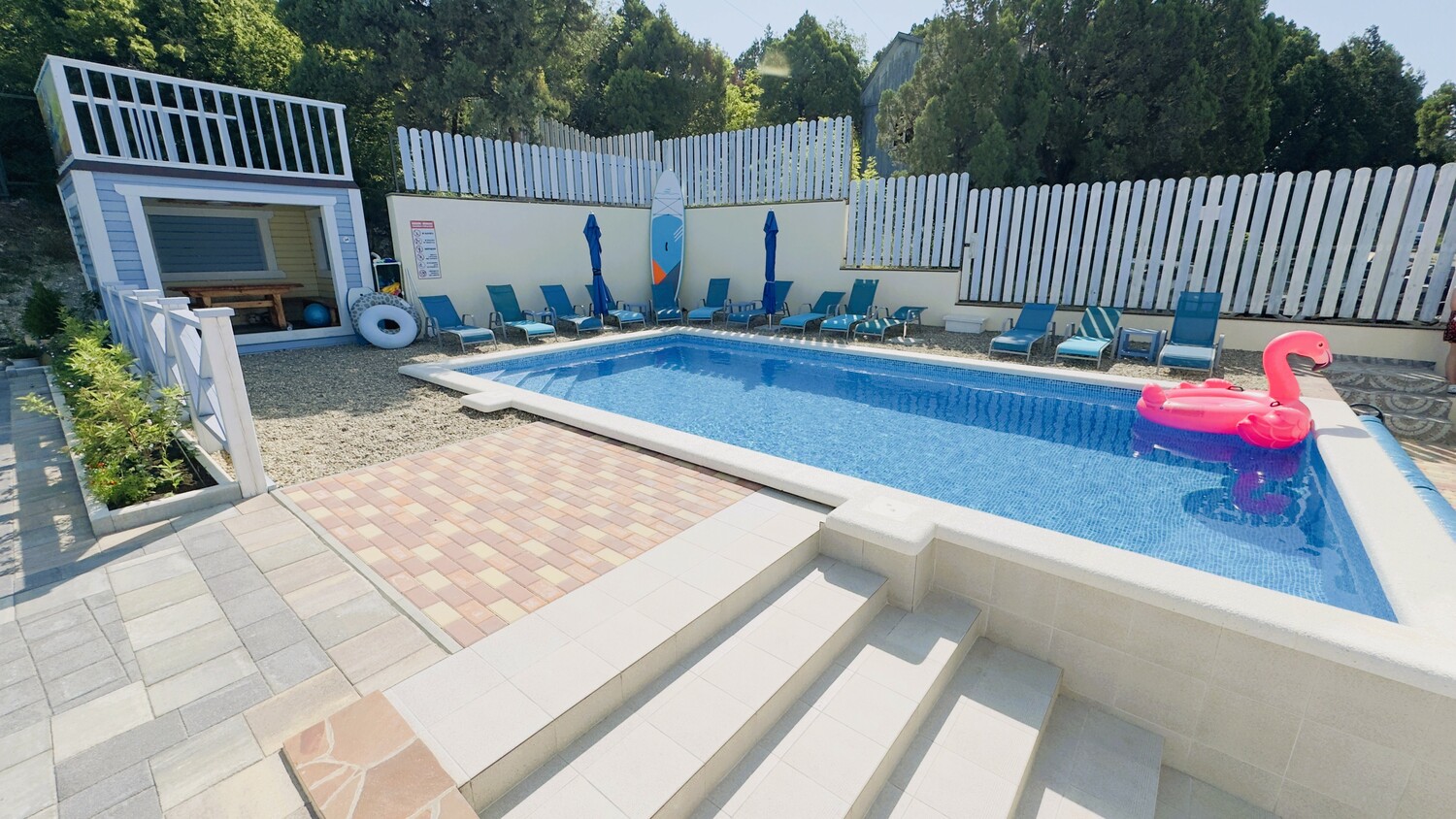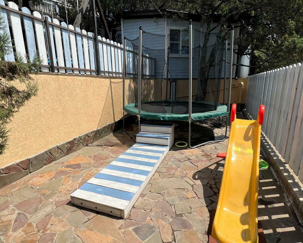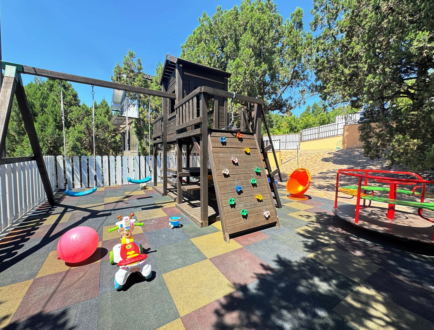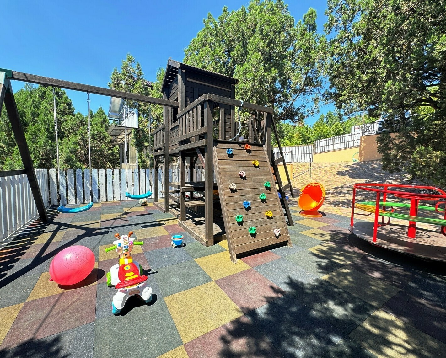 Благоустроенная территория с детским городком, бассейном, батутом, зоной гамаков и травмобезопасным покрытием. Для малышей — кроватки, стульчики, а также бесплатные водные принадлежности (маски, ласты, круги).