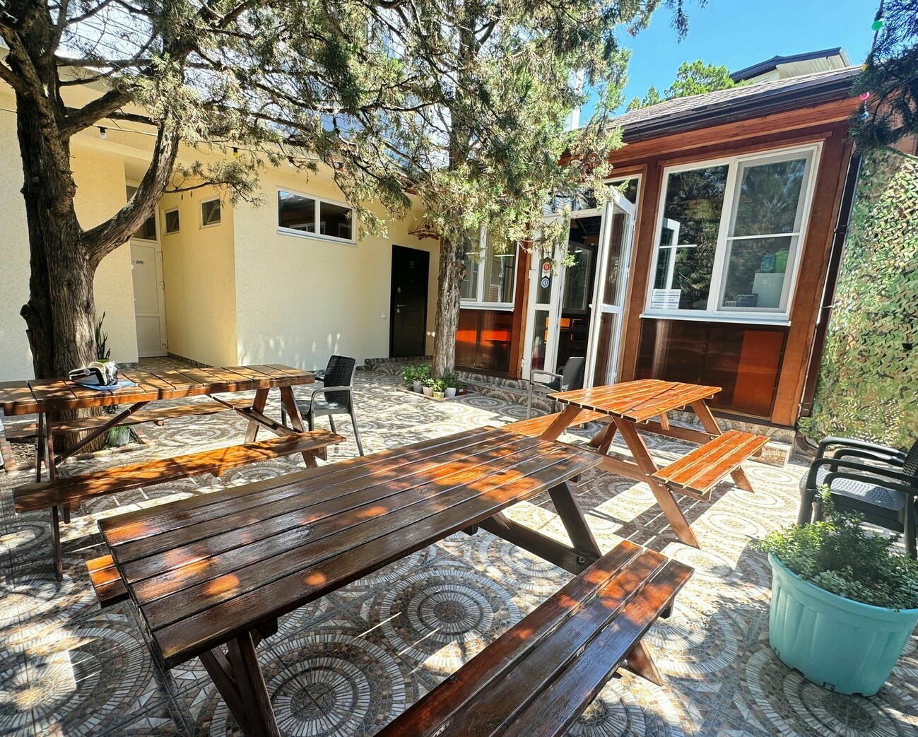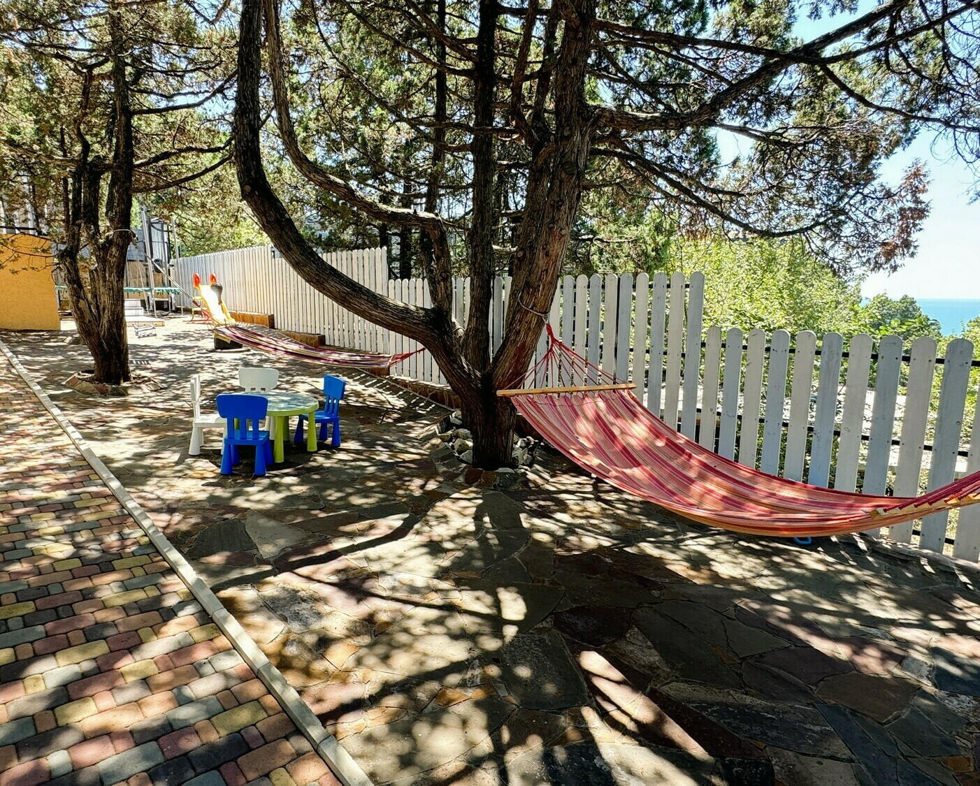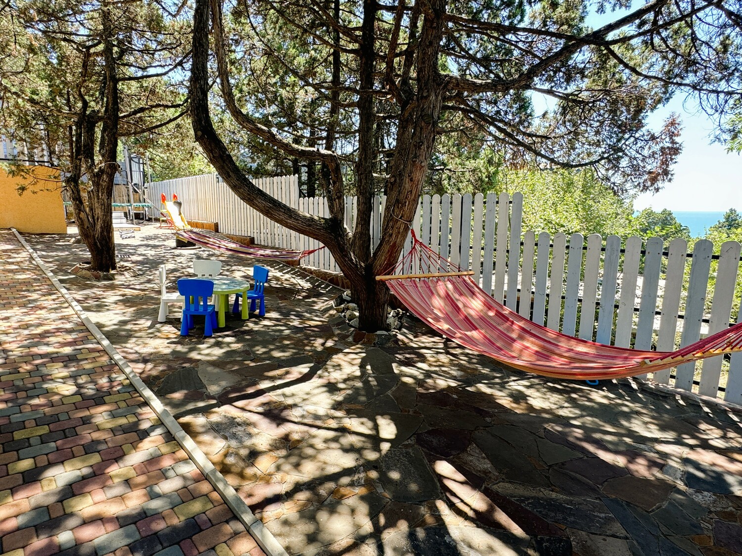 Благоустроенная территория с детским городком, бассейном, батутом, зоной гамаков и травмобезопасным покрытием. Для малышей — кроватки, стульчики, а также бесплатные водные принадлежности (маски, ласты, круги).