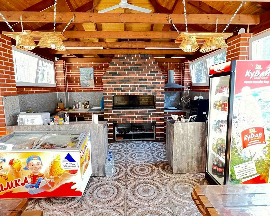 Просторная кухня-столовая с витражным остеклением, казаном, посудой и техникой. Шампура и решетки для барбекю — бесплатно. Можно готовить независимо от погоды.