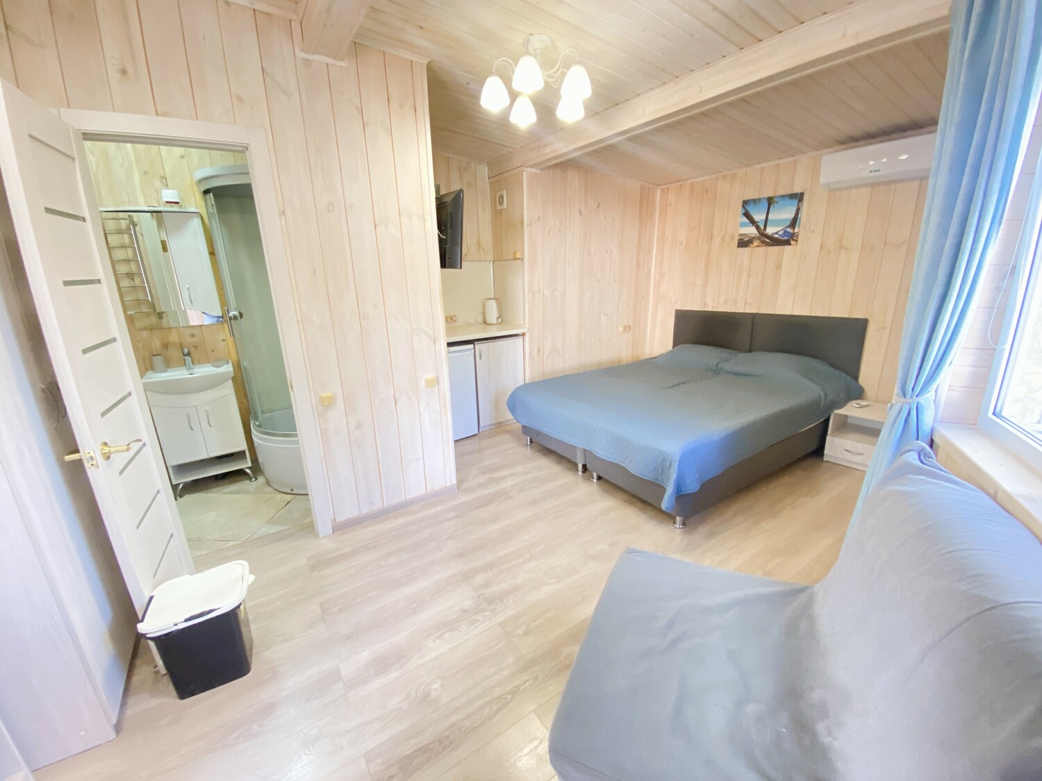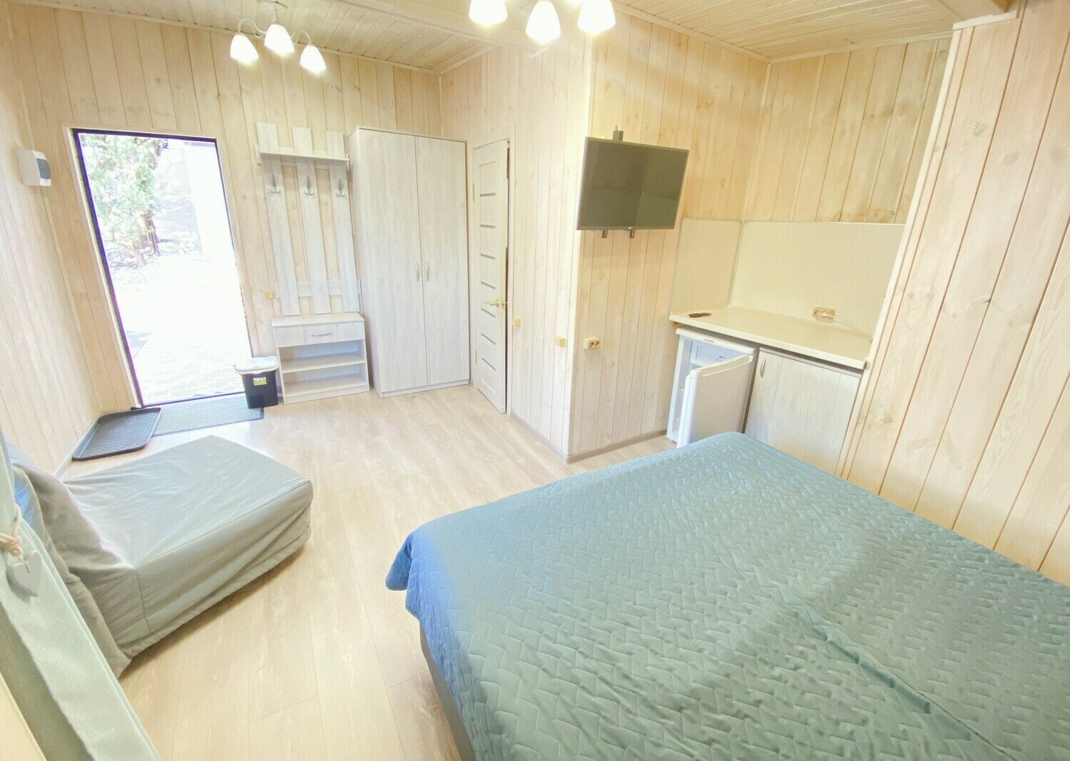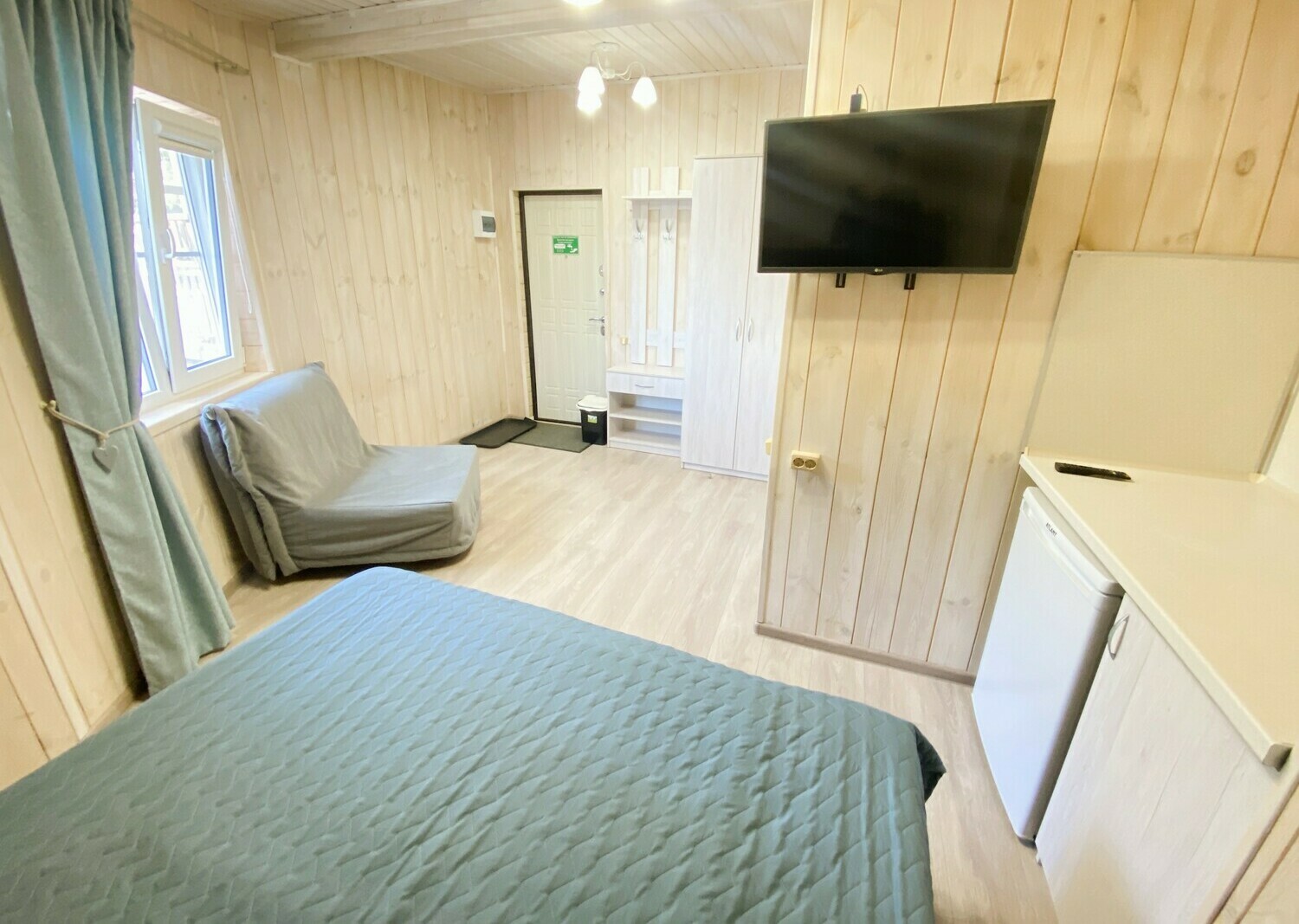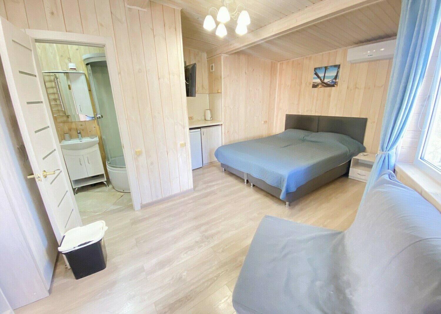 Очень комфортный номер для небольшой семьи. Отдельный вход. В номере большая двухспальная кровать (можно раздвинуть на 2 отдельные) + кресло-кровать. холодильник, сплит, телевизор. Рядом, за дверью, столики под столетним можжевельником, зона отдыха, общая кухня.