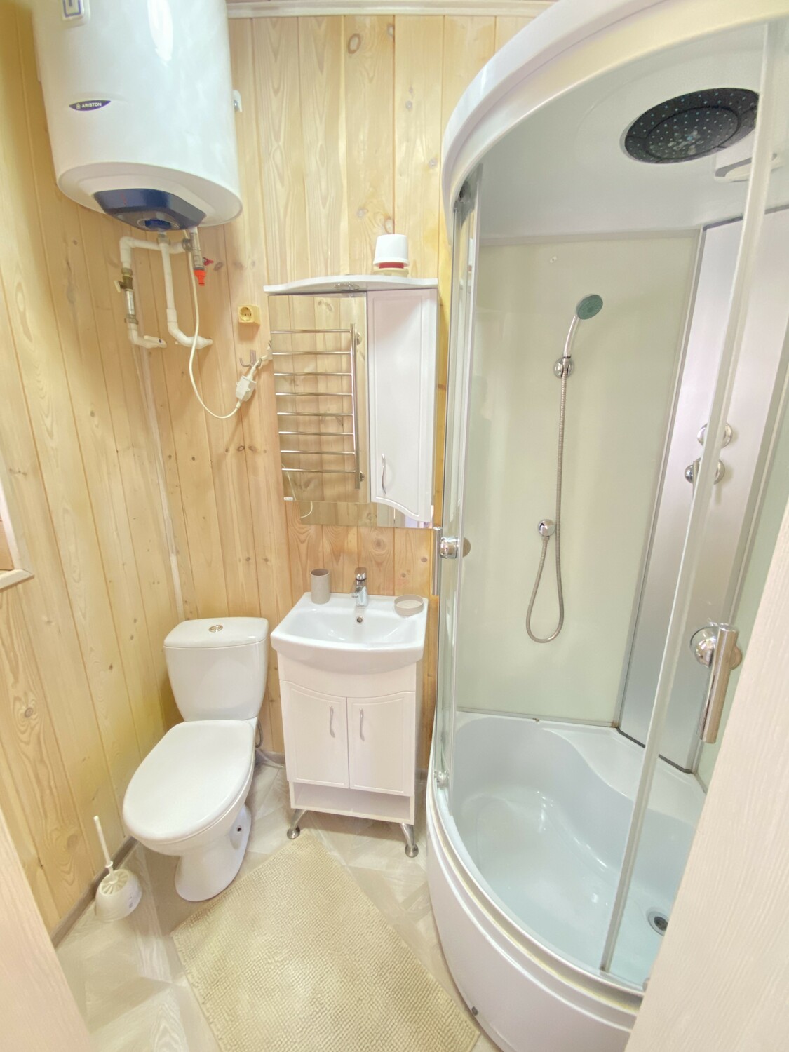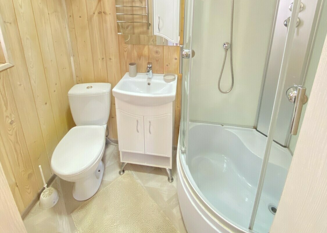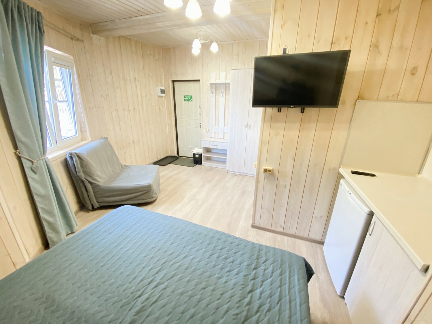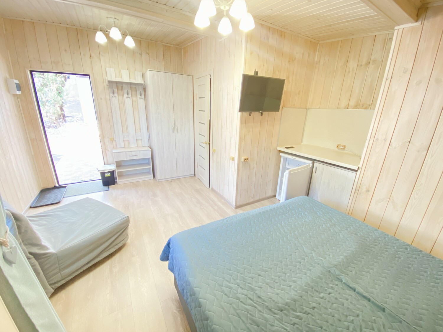 Очень комфортный номер для небольшой семьи. Отдельный вход. В номере большая двухспальная кровать (можно раздвинуть на 2 отдельные) + кресло-кровать. холодильник, сплит, телевизор. Рядом, за дверью, столики под столетним можжевельником, зона отдыха, общая кухня.